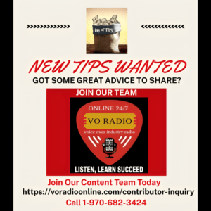 We have 5 options to participate: Our a regular 24/7 Feature, our Bag of Tips, our NEW Weekend Power Podcasts and our live Let’s Talk VO radio show, and our live VO Tubee video show both as a guest panelist.